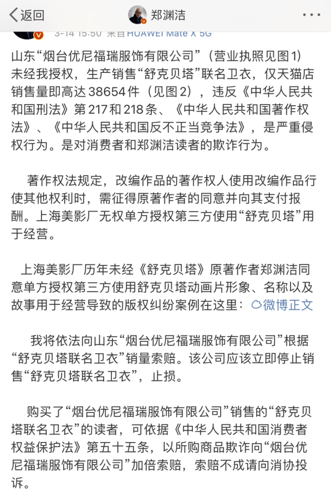 2021年3月14日,童话大王郑渊洁“率先发难”,在微博上发表了一则公开声明,指责烟台优尼福瑞服饰有限公司所生产的“舒克贝塔”联名服装属于严重侵权,是对消费者和郑渊洁读者的欺诈行为。并将矛头引向了此次“IP授权”背后的巨头——上海美影厂。