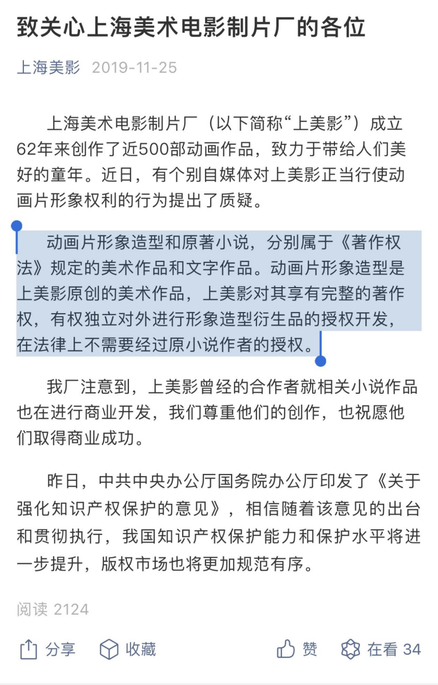但就在郑渊洁的版权通告发布后不久,美影厂也发表了一篇公告予以回应。