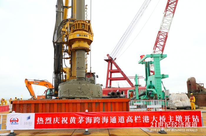 其中,高栏港大桥主墩基础采用群桩基础结构,设31根钻孔灌注桩,直径3米,桩长86-110米,最大孔深约120米,属于海上大直径超长基桩施工,由中交路桥建设有限公司、中铁大桥局集团有限公司联合承建,东、西两座主塔同时启动建设。