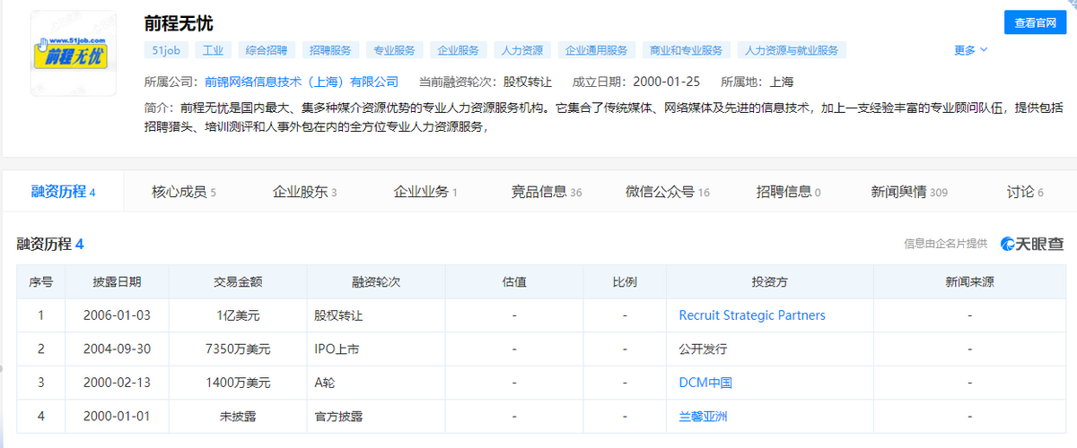 天眼查APP显示,前程无忧可谓是老一辈招聘领域的代表。2000年就已成立,4年时间就IPO,招聘行业可以说是中国最早吃到互联网红利的行业之一,然而曾经辉煌的线上招聘三巨头,中华英才网在2015年被58并购,前程无忧与智联招聘则在今年的315纷纷被请去“喝茶”。老巨头们究竟哪里出了问题?