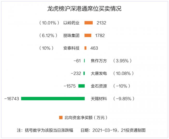 3月19日,北向资金参与龙虎榜中的个股共有7只,合计净卖出1.42亿元。其中沪股通净卖出2 股,合计净卖出1806.82万元;深股通净买入3 股,净卖出2 股,合计净卖出1.24亿元。
