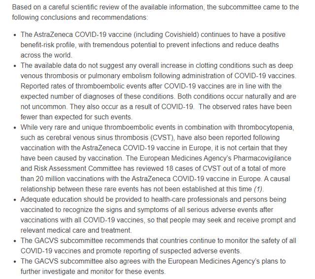 世卫组织12名独立专家分别在周二和周四举行了会议,审查了来自欧洲、英国、印度和世卫组织全球数据库的安全数据,最终得出结论,现有数据尚不能证明血栓和血小板减少症是由疫苗引起的。
