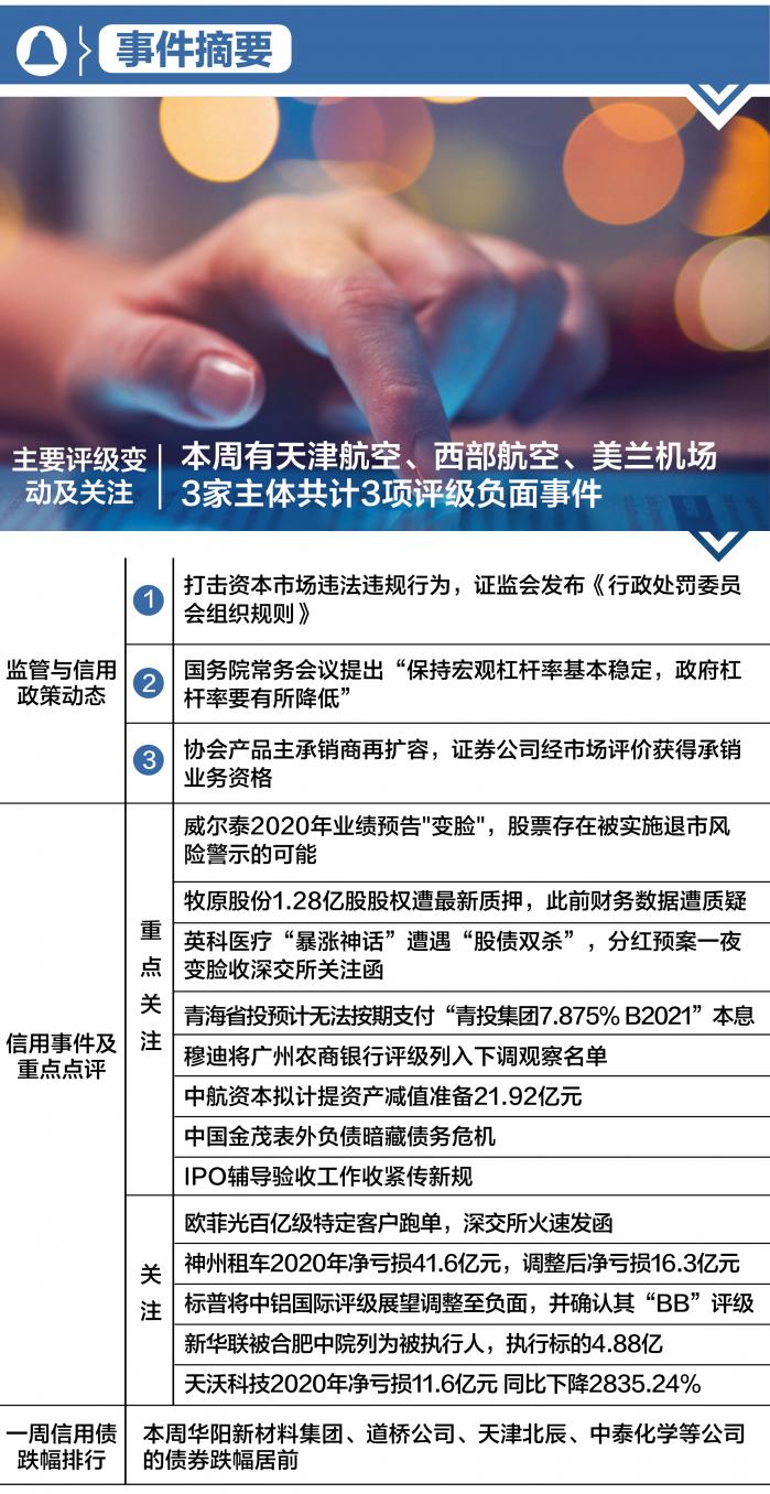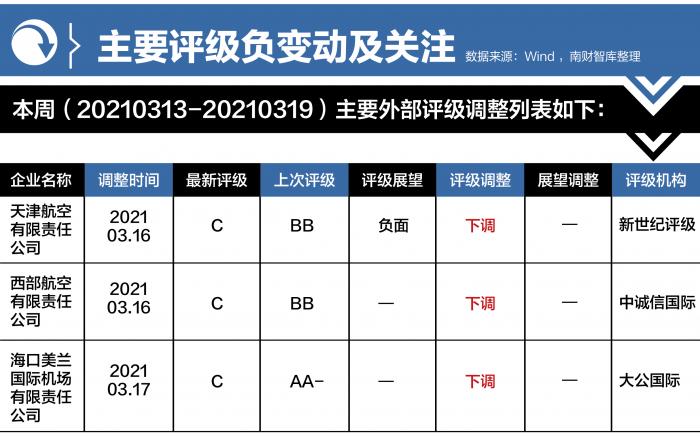 本周的外部评级共有3个主体,共计3项评级负面事件,其中天津航空有限责任公司、西部航空有限责任公司以及海口美兰国际机场有限责任公司评级均被下调。