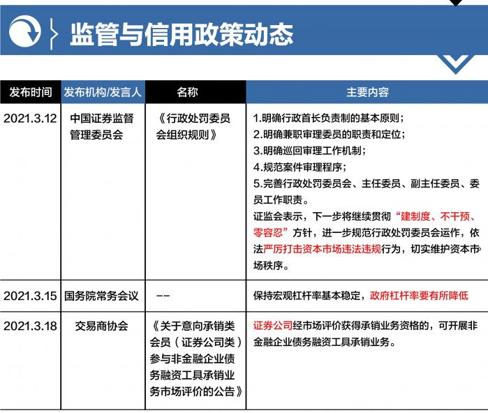 本周共有3项主要监管与信用政策动态:(1)打击资本市场违法违规行为,证监会发布《行政处罚委员会组织规则》;(2)国务院常务会议提出“保持宏观杠杆率基本稳定,政府杠杆率要有所降低”;(3)协会产品主承销商再扩容,证券公司经市场评价获得承销业务资格可开展承销业务。