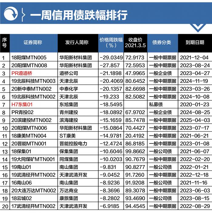 本周交易日(20210315-20210319)信用债(包括企业债、公司债、中期票据、短期融资券)价格跌幅(排除派息等因素导致的价格下跌)前20只债券,跌幅范围为-29.03%~至-6.92%。