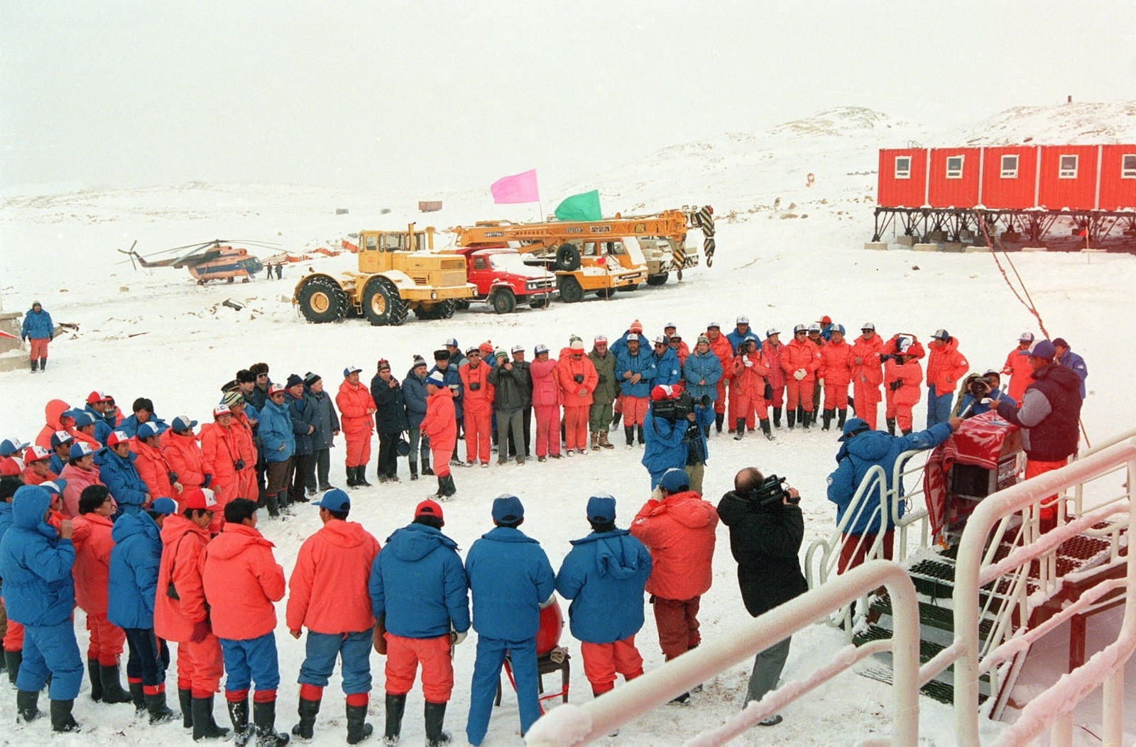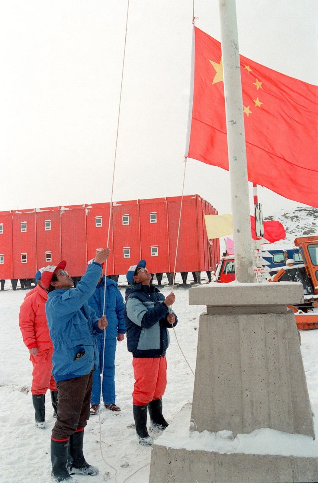 在1989年1月26日中山站举行的奠基仪式上,队员们升起鲜艳的五星红旗