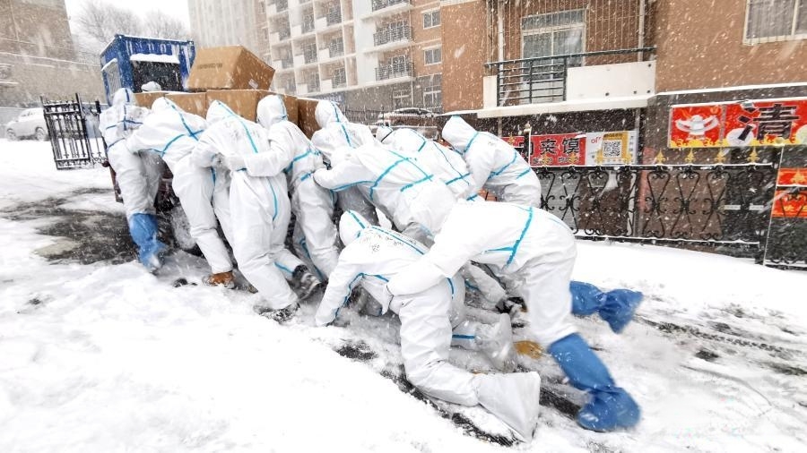 ▲2021年1月6日,大连海洋大学的学生们顶风冒雪推车运送防疫物资。