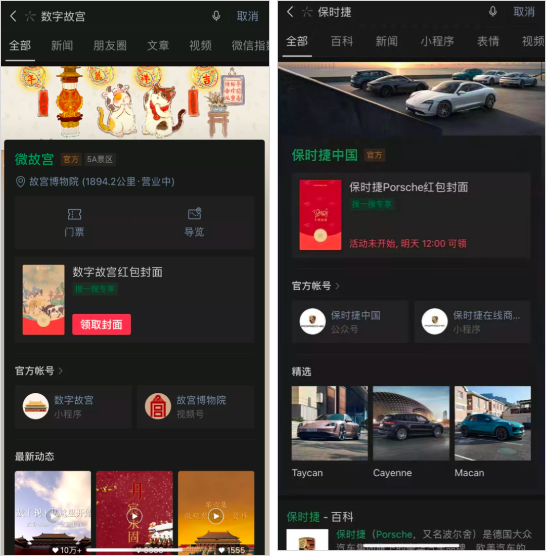 根据官方数据,今年春节期间,有 96 家品牌通过搜一搜发出约 4000 万个红包封面,包括故宫、人民日报、肯德基、B站等,平均每个品牌在活动期间流量提升约 50 倍。