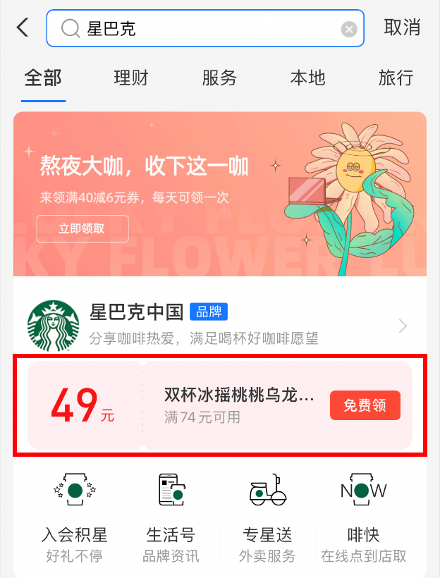 前两天,朋友跟我说支付宝有星巴克的“羊毛”可以薅,只要在支付宝搜「星巴克」就可以领取新品优惠券。