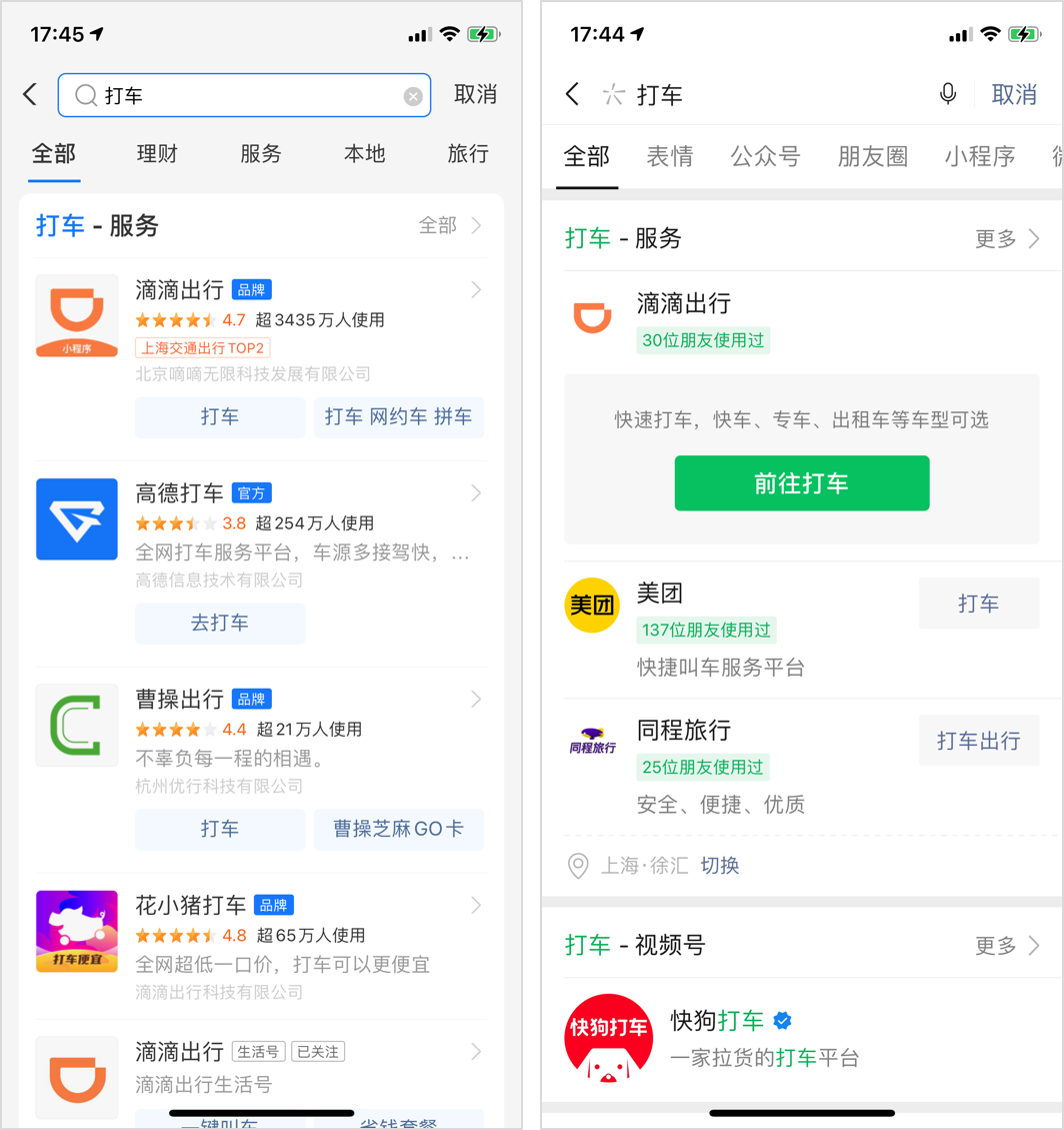 以打车的服务搜索结果为例,支付宝搜索的推荐标签是「x万人使用」;