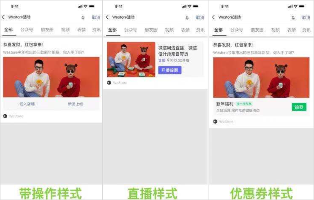 比如,微信搜一搜有「优惠券」、「直播预热」、「红包封面」等多种引流玩法。