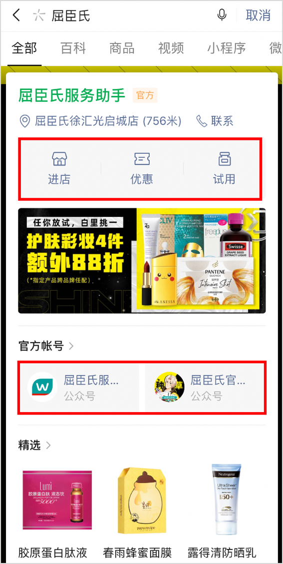 以屈臣氏为例,「进店」对应的是屈臣氏云店(官方小程序)首页,「试用」对应的是屈臣氏种草社小程序;同时官方的公众号也不止一个。