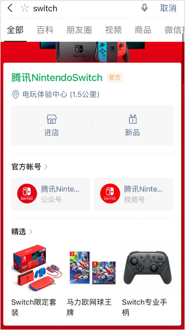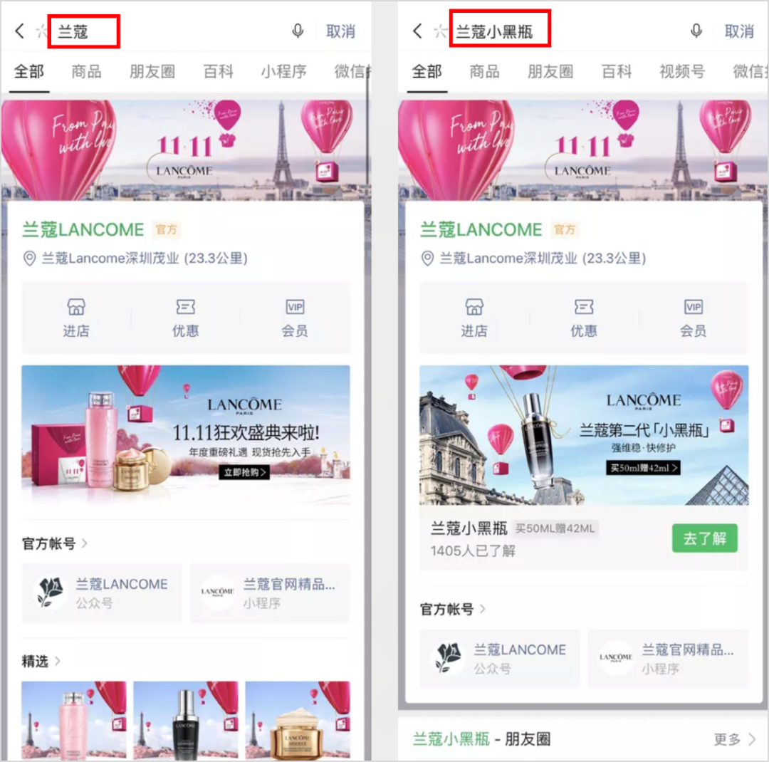 而微信搜一搜的品牌页则主要聚合了品牌自身的小程序、公众号、视频号等入口,以快捷功能和官方账号的形式呈现,如果是零售餐饮等有线下门店的行业,还会有附近门店展示。
