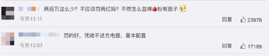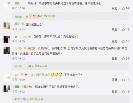 不过,有网友对此表示:“苹果的吃相越来越难看,买个手机竟然还要额外花钱买充电头和线。”还有人对这一罚单拍手称赞,并称“罚得好!手机不带充电头就相当于吃饭不给碗。”