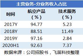 恒宇信通的主营业务收入可以分为航空产品和技术服务两大类。报告期内,航空产品占公司营收的绝大多数,整体在90%以上,技术服务占比较小,整体在10%以下。