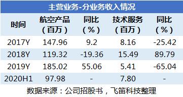 2018年,航空产品实现收入1.19亿元,同比下降19.36%,公司解释,主要受军改影响,部分型号产品暂缓订单执行所致。2019年,航空产品实现收入1.85亿元,同比增长55.06%,较往年增长幅度较大,原因在于军改逐步到位,部分延迟交付的产品逐步交付;同时新型号产品完成定型,需求量有所增加;以及国家部队作训任务增加,对航材备件的需求增加。到了2020年上半年,航空产品实现收入9798万元。