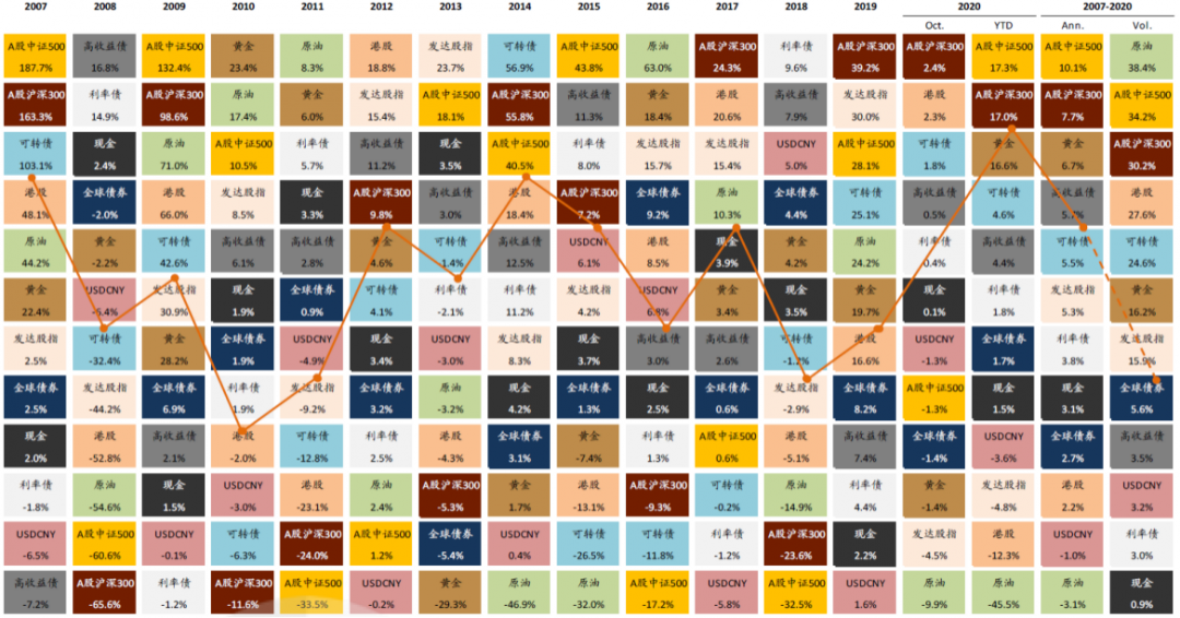 1、同样的资产类别,在不同的年份里,投资表现截然不同,没有永远赚钱的资产类别,经济的周期性波动会对不同的资产产生不同的影响,比如在经济复苏期间,往往股票市场表现相对较好;而在经济衰退期间,债券市场的表现相对较好。另外,央行的每一次放水也都会影响资产的价格,无论是中国市场还是美国市场,都一定程度上印证了经典的美林投资时钟的有效性。(见图)
