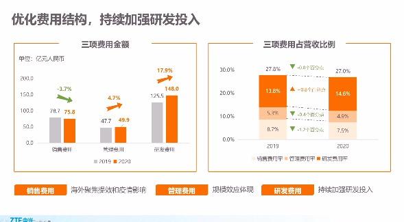 他续称,2020年海外受疫情影响严重,跨国商务基本暂停,政治经济形势依然复杂。这样的外部环境下,中兴通讯海外市场依然取得了2.7%的收入增速,且海外市场毛利率同比上升约5个百分点至37.2%,应收账款减值损失下降十多亿,海外经营为公司利润做出了正向的贡献,这也改变了以往大家对海外市场“赔钱赚吆喝”的态度,且这种态势是可持续的。