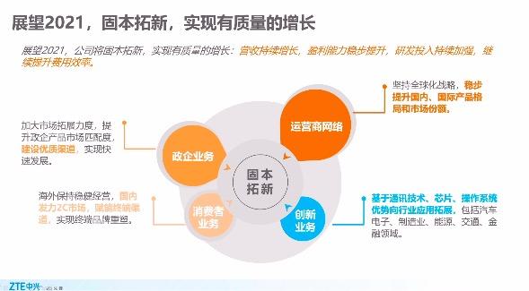 在3月22日中兴通讯举行的线上2020年度业绩说明会期间,公司执行副总裁、财务总监李莹表示,在2019年底,公司如期完成恢复期目标,截至2020年底,发展期的各项工作进展顺利,经营健康、市场格局不断优化,并在有序推进新业务孵化。