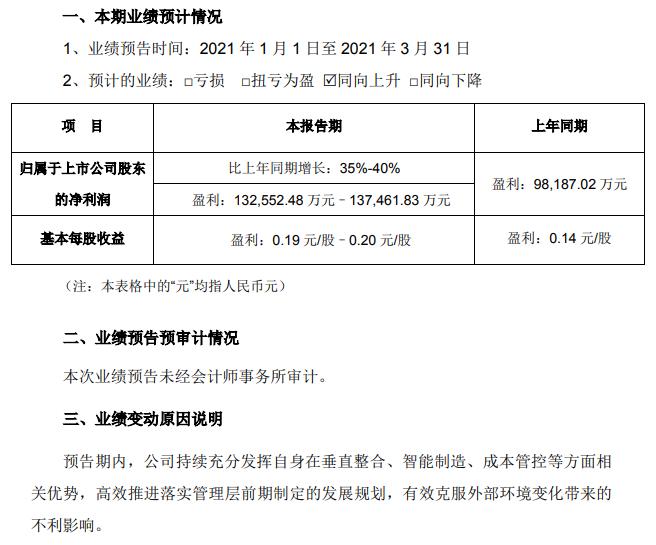 3月22日晚间,立讯精密(002475)公告称,预计2021年一季度归属于上市公司股东的净利润盈利13.26亿元–13.75亿元,同比增长35%-40%。同时,立讯精密发布业绩快报,2020年度实现净利润72.33亿元,同比增长53.44%。