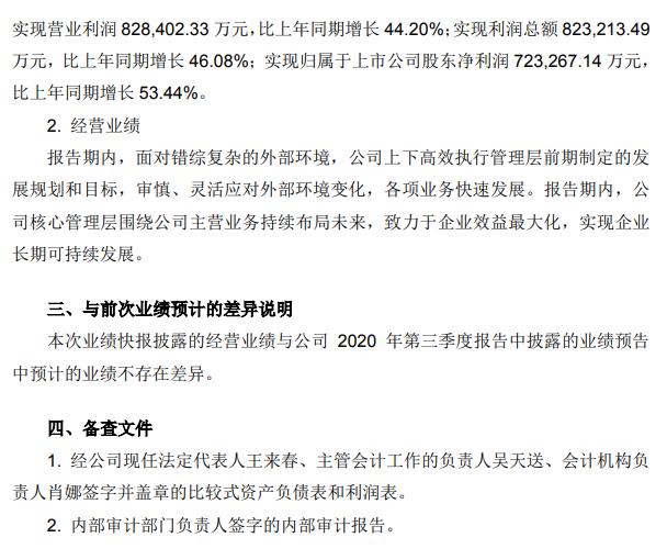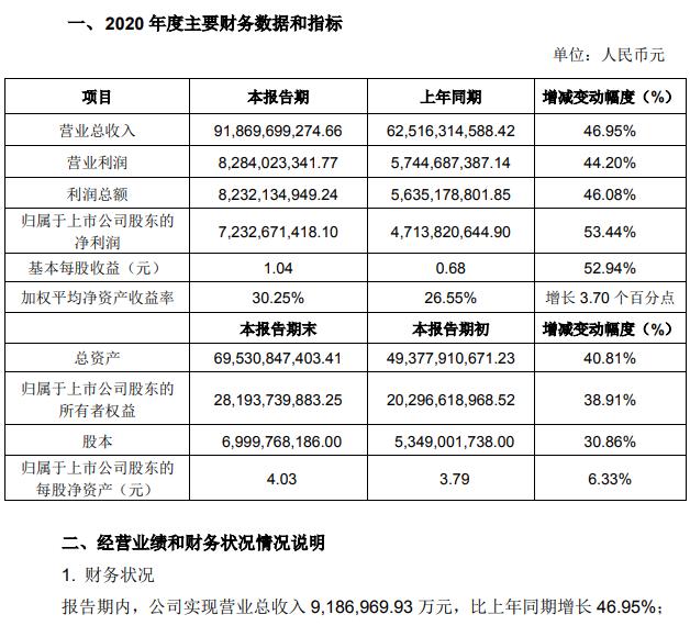 2020年全年,立讯精密实现营业总收入9,186,969.93万元,比上年同期增长46.95%;实现归属于上市公司股东净利润 723,267.14万元,比上年同期增长53.44%。