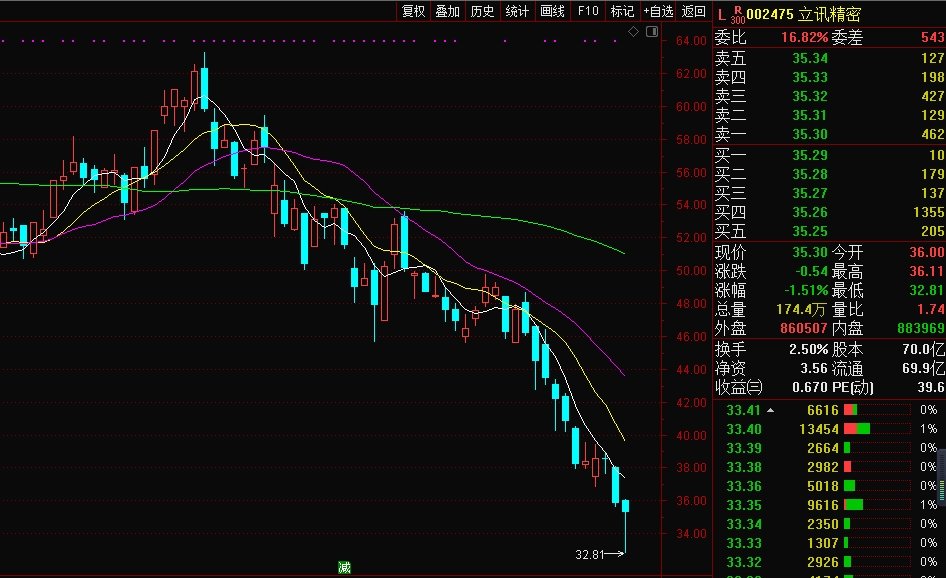 继前一交易日大跌7%后,立讯精密今早开盘继续被疯狂砸盘,盘中一度暴跌8%,股价最低下探至32.81元/股,刷新一年多新低。值得注意的是,1月13日,立讯精密股价创下年内新高,达62.11元/股,市值超过4400亿元,不过在短短两个月后,股价已接近腰斩,市值已不足2500亿元。