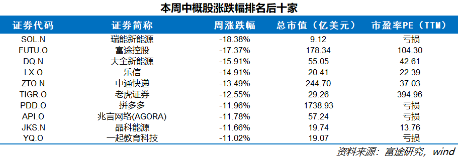 本周热门中概:本周市场热点较为零散,多为个股机会,未见显著做多的主线行情;新能源板块继续出现集体回调,瑞能新能源、大全新能源、晶科能源出现大幅回调,跌幅均超过10%,板块持续承压。