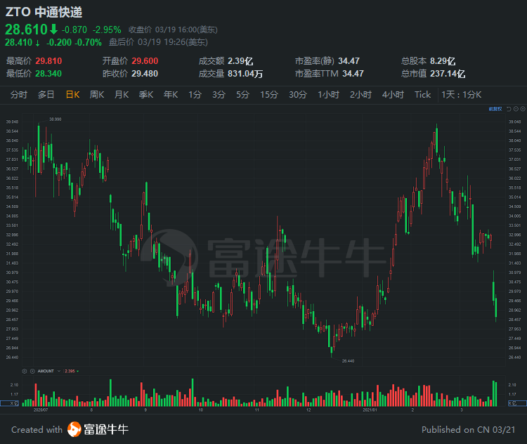 3月18日,中通发布2020Q4财报,Q4收为人民币82.57亿元,同比增长20.6%;Non-GAAP 净利润12.91 亿元,同比下降20.9%,低于市场预期,行业价格战日趋激烈导致公司单票收入显著下降,进而拖累业绩。财报发布后,股价持续下跌,本周累计跌幅-13.49%。