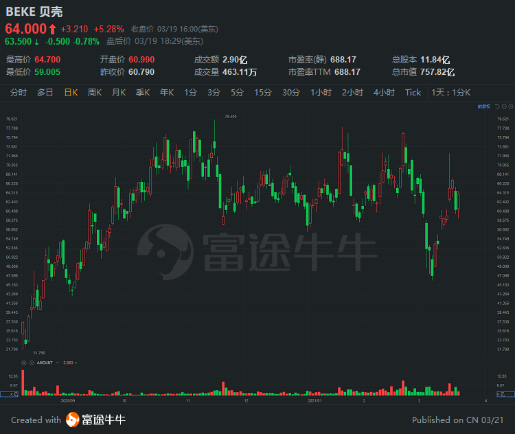 3月5日盘后,贝壳在公布业绩,Q4净营收226.7亿元人民币,同比增长57.6%;调整后净利润20.01亿元,同比增长4424.8%;交易总额(GTV)达1.12万亿,同比增长65.4%。同时,公司预计2021Q1净营收将在185亿元至195亿元之间,同比增长约159.8%至173.9%。受当期财报数据刺激以及积极的业绩指引影响,本周贝壳走势较好,累计上涨8.55%。