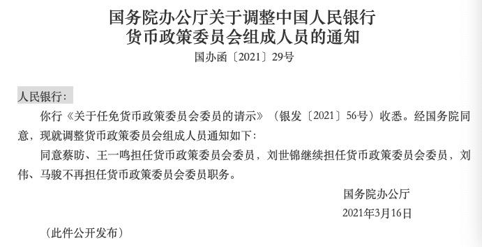 国务院办公厅3月20日公布的《关于调整中国人民银行货币政策委员会组成人员的通知》称,国务院已同意蔡昉、王一鸣担任货币政策委员会委员,刘世锦继续担任货币政策委员会委员,刘伟、马骏不再担任货币政策委员会委员职务。