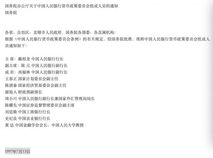 首届货币政策委员会的构成人员名单如下,当时周小川还是央行副行长: