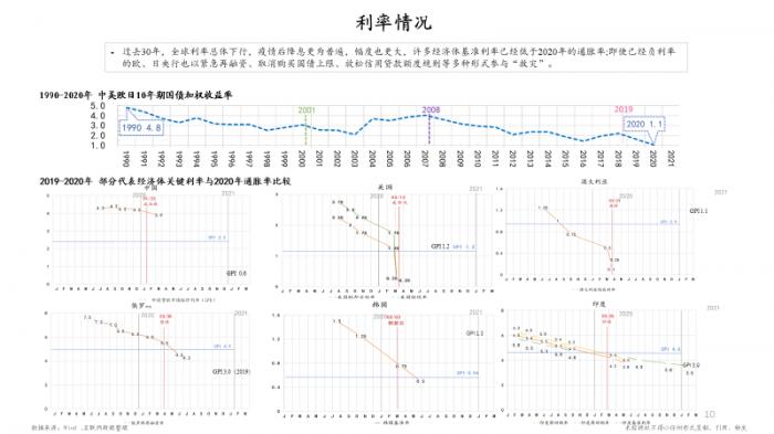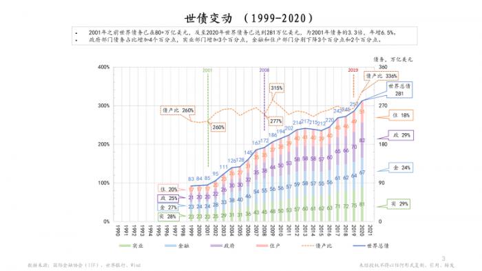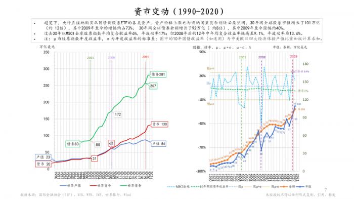 左图就是刚才第一张图中债务、货币、产值的基本图景。对比看一下右边这张图,蓝色线是世界股票市值,它也是系统地增长(30年,12倍),橙色线是债券总额也是在不断增长。绿色的虚线则是主要经济体的十年期国债加权利率,它从1990年的4.8%到2020年差不多只有1%了,这其实可以作为一个利率的参考基线。如果国债利率作为基础,那么一般的商业债利率,可能要再加高2个百分点,也就是从7%降到了3%,这实际上是一个很大的下降,虽然债务/利息总规模在不断上涨。蓝色的虚线代表的是股市每年的涨跌变化,变化幅度很大,甚至都很难看出什么特别的规律,但30年平均年回报率其实也只有6%,波动性大是股票投资的一个基本特点。从另外一个侧面来看可能也说明了一个问题,股市价格有很强的通胀特征,一般老百姓可能很难判断,一只股票从10块钱涨到15块,它是因为这个企业价值涨了50%呢?还是因为通胀(市场流动性甚至投机炒作)了50%?这个跟地产价格也很类似,同期的地产通胀价值也是很高的。