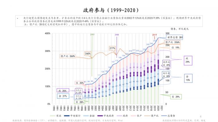 图中紫色柱体是政府债务,中央政府债务占政府总债务比例从1999年差不多33%,增到现在49%。而蓝色柱是金融债务,其中央行占比也是从13%增至39%,翻了3倍,这可以看出来,中央级政府机构参与经济货币债务化的程度越来越高。刚才我们也谈到了通过货币刺激经济提升,并不是很有效果,反而债务越积累越多。金融危机刚发生,政府这些救助从短期来看是有一定效果的,但是这些措施没有退出,而是长期维持救助刺激状态,这就应该要从是否可持续发展的角度来看待了。