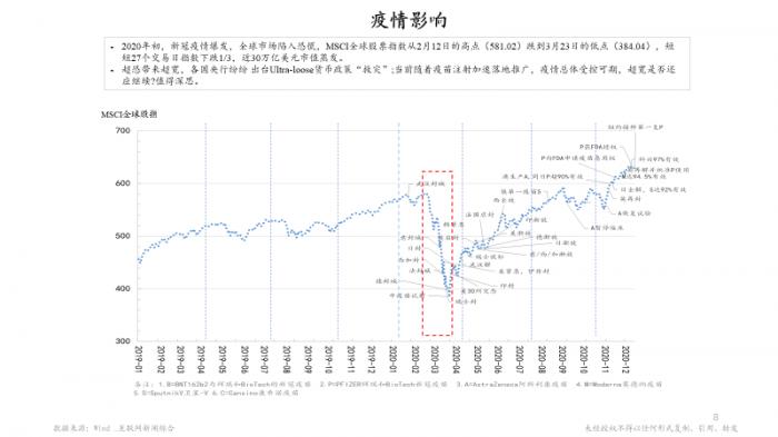 下面这张疫情的图,体现了疫情发生的一些主要事件,以及MSCI全球股票指数在疫情以及政府措施双重影响下的对应涨跌,今天因为时间不够就不展开讲了。