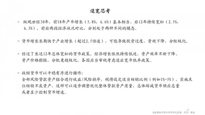 如何退出?可能也并不难,是可能有效平稳地来进行,为什么?比如我们要收缩货币,实际上就是应该把那些贷款,那些风险贷款组合排序,最好的当然可保留,收益最差的、风险最高的放在最后,再根据自身情况设定一个核销的比例,逐渐地开始缩减、核销,实施末位淘汰核销。这样可以逐步地调整、优化整体的贷款质量,这样的措施对经济增长也会有良性互动作用。因为在一个经济体内,如果一个本身有问题且将来没有生命力的企业,借助了政府救助一直维持,是占用资源影响资源有效应用,它会侵蚀其他更好的企业的业务发展,出现恶性竞争等等情况。你把它们清除了,其实剩下的企业会变得更好,会交更多的税创造更多就业岗位,所以是可以反过来弥补政府因为不良企业破产带来的金融损失、社会影响。这样的话,是可能在对经济影响相对不大的情况下,同时达到缩减货币供应总量或者至少控制货币增长速度的效果,至少是一个值得考虑的方向。
