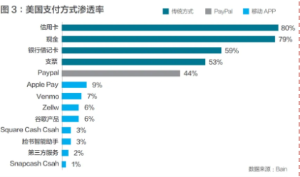 美国智能手机用户约2.3亿。目前主要的移动支付提供方是Apply Pay,Google Pay和Samsung Pay。这三者的市场占有率分别为47%、 19%,和17%。