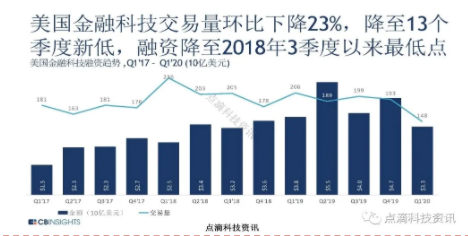 从投资领域来看,2019年,美国在并购、风险投资和私募股权领域的金融科技投资总额略有增长,创下了598亿美元的年度新纪录。其中,Fiserv以220亿美元收购了支付处理公司FirstData,助推金融科技融资的强劲增长。2019年Q1、Q2,美国金融科技投资额几乎持平,合计超100亿美元,占年度投融资总额174亿美元的一半有余。但受新冠疫情影响,2020年Q1,美国金融科技融资涉及148笔交易,仅达到33亿美元的投资额。