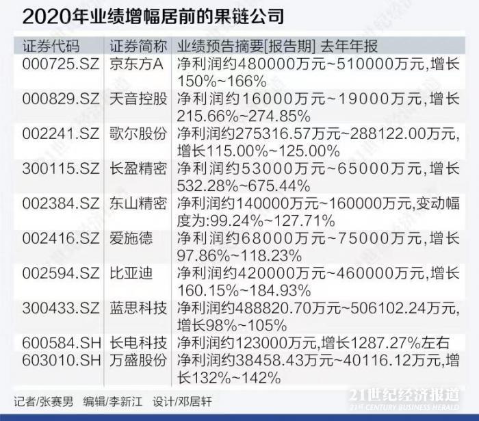 公开数据显示,苹果概念股龙头如歌尔股份、蓝思科技等的净利润同比增长均在100%上下,立讯精密预计去年净利润增幅也在55%。