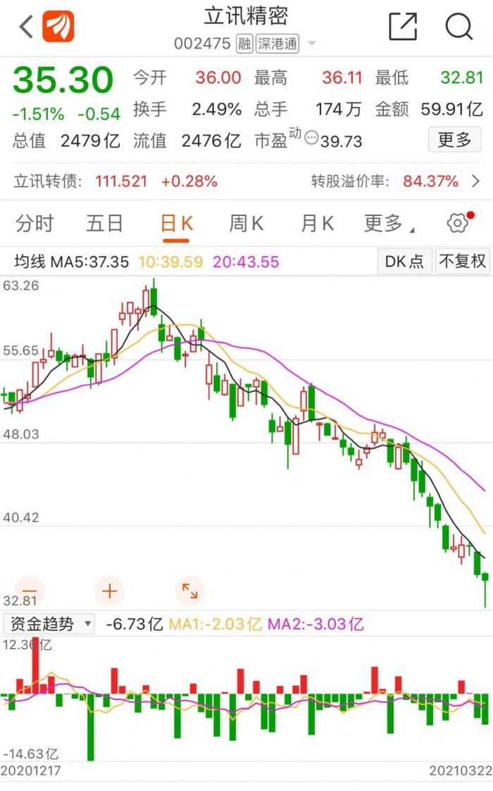 3月22日,果链白马立讯精密开盘以36元/股高开后,立即出现断崖式下跌,股价一度下探至32.81元/股,跌幅超过8%,随后出现恢复性回升,截至收盘跌幅收窄至1.51%,股价收报35.14元,创下2020年6月以来新低,总市值2479亿元。