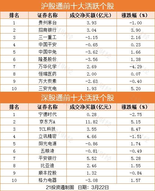 十大活跃个股方面,京东方A、平安银行、立讯精密分别获净买入11.82亿元、5.52亿元、4.66亿元。中国中免净卖出额居首,金额为3.62亿元。