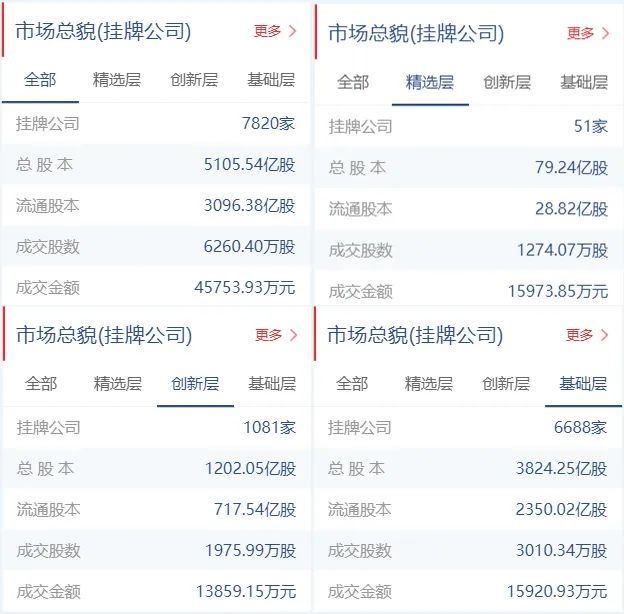 截至3月23日收盘,今日成交金额为4.58亿元,精选层成交金额为1.60亿元,创新层成交金额为1.39亿元,基础层成交金额为1.59亿元;今日成交股数为6260.40万股,精选层成交股数为1274.07万股,创新层成交股数为1975.99万股,基础层成交股数为3010.34万股。