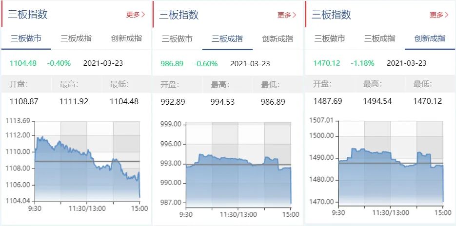 截至3月23日收盘,三板做市报1104.48点,下跌0.40%;三板成指报986.89点,下跌0.60%;三板创新成指报1470.12点,下跌1.18%。