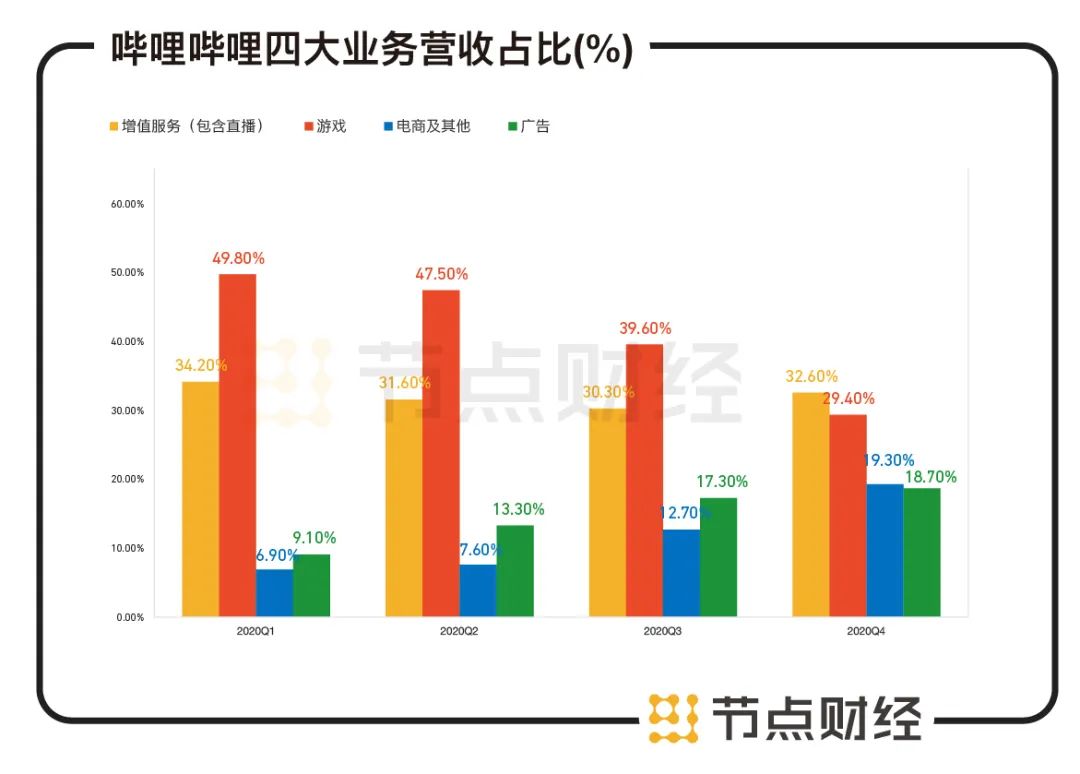 过去很长时间,游戏都是B站最重要的营收来源,这一情况在2020年第四季度首次发生了改变。