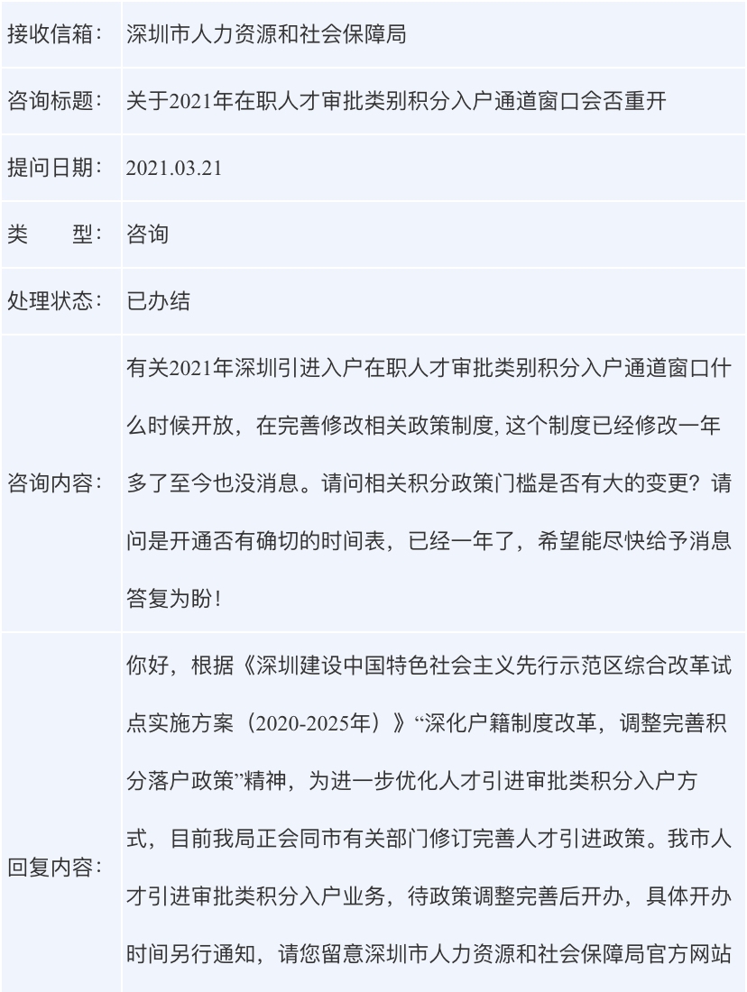 “我市人才引进审批类积分入户业务,待政策调整完善后开办,具体开办时间另行通知,请您留意深圳市人力资源和社会保障局官方网站的通知公告。”上述回复中说。