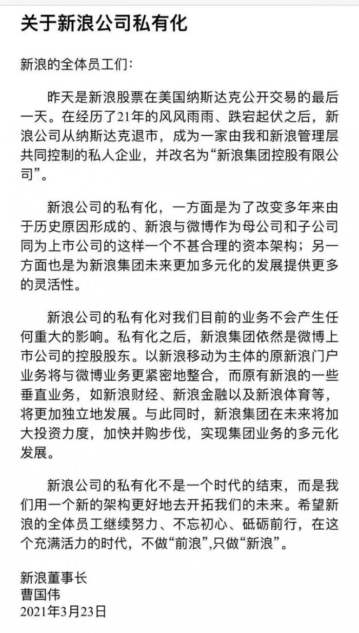 曹国伟发布内部信:正式宣布新浪完成私有化