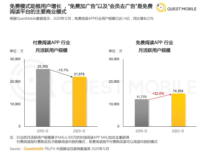 去年一年,免费阅读领域发展飞速。根据QuestMobile发布的《2020中国移动互联网年度大报告·下》显示,2020年12月,免费网文App行业用户规模1.44亿,较上年同期的1.18亿,增长了22%,这说明免费阅读仍处在一个高速增长期。而与此相对应的是,付费阅读APP月活的倒退。