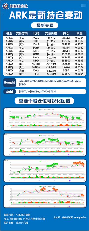 由于ARK基金管理的ETF的业绩非常出色,ARK会公布每日持仓动作。3月24日,美股研究社整理该基金持仓动作如下: