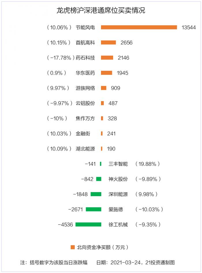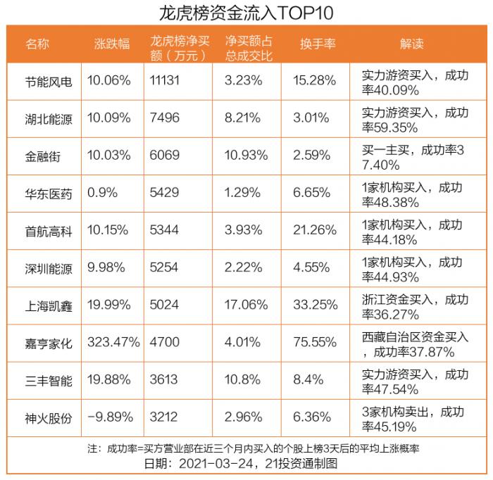 3月24日,上证指数下跌1.3%,深证成指下跌1.47%,创业板指下跌1.25%。盘后龙虎榜数据显示,共有50只个股因当日异动登上龙虎榜,资金净流入最多的是节能风电(601016.SH),达1.11亿元。
