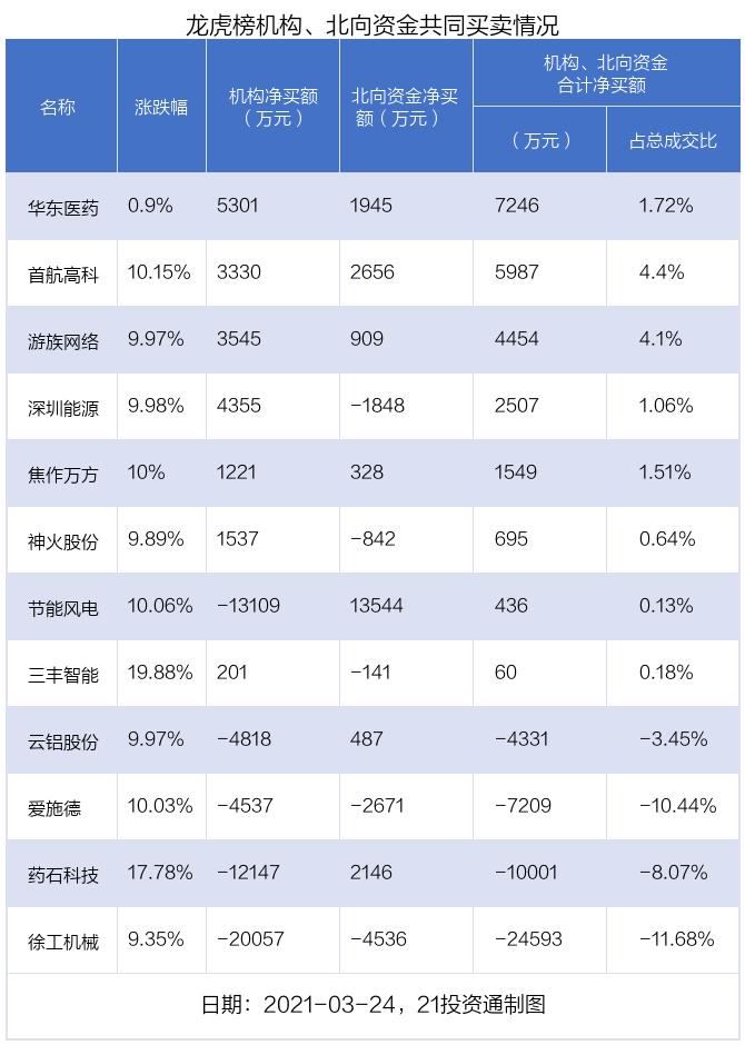 值得注意的是,机构和北向资金共同净买入了首航高科、华东医药、游族网络、焦作万方等4股;共同净卖出了爱施德、徐工机械等2股;在节能风电,药石科技,云铝股份,三丰智能,神火股份,深圳能源上出现分歧,机构净卖出节能风电1.31亿元,北向资金净买入1.35亿元;机构净卖出药石科技1.21亿元,北向资金净买入2146.13万元;机构净卖出云铝股份4818.13万元,北向资金净买入487.08万元。