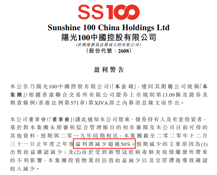 3月22日,阳光100发布盈利警告:2020年盈利同比或将减少五成。
